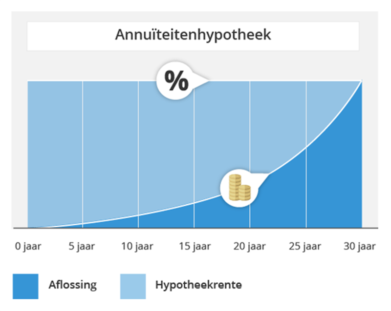 Een annuïteitenhypotheek is een hypotheekvorm waarbij u iedere maand een vast bedrag betaalt. Dit bedrag bestaat uit een deel rente en een deel aflossing. Het vaste bedrag noemen de we de annuïteit.